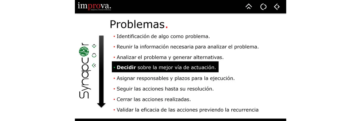 Pero Synapcor ha nacido con la idea de proporcionar eficiencia a los procesos de toma de decisiones y resolución de problemas. Desde la identificación de la necesidad de actuar hasta que el problema o la desviación quenos preocupa están resueltos y controlados.